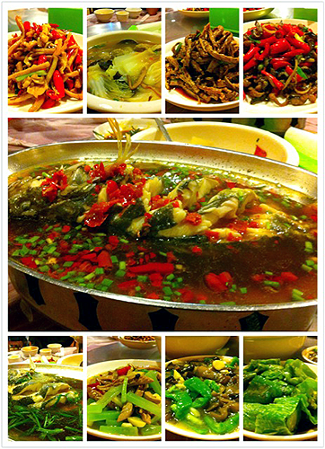 - 辣鳜鱼:好像有点贵,¥90起。鳜鱼两侧开口,加切碎的小米椒、葱花和调味料一起蒸熟,然后加上高汤,在加热的盆子里端上来的。鱼肉果然十分鲜美细嫩。