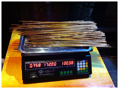 既然是初体验,我也就算是外地人看新奇了一次。以前吃串串是吃完了人工数竹签来算钱。现在好了,竹签都是统一的大小,不用人工数,直接称重量,算多少钱一公斤竹签。朋友说这些称很精确的,一根竹签都能称出来。如果你想问这样的话怎么区分比较贵的肉和便宜的蔬菜的话,聪明的成都人民想到了最简单的方法–使用单位价计算。就是一般蔬菜就穿在一根竹签上,而贵一点的肉则会在每一块上穿入2-4根签子,这样买卖双方都不会觉得吃亏。