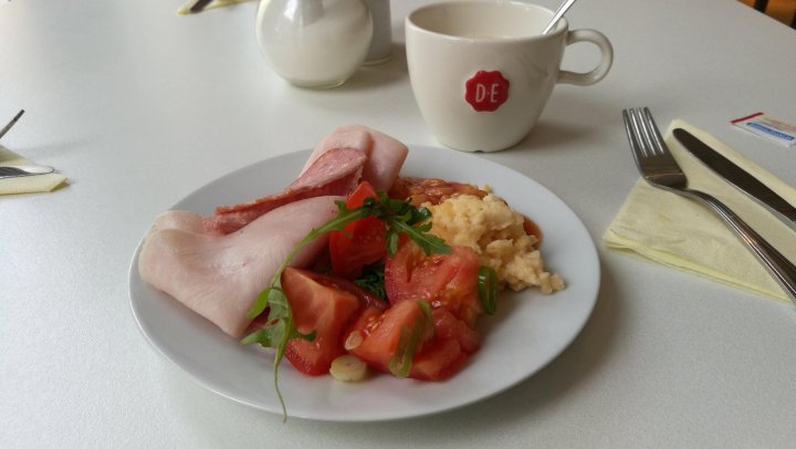 这个酒店旁边有一个会议中心,所以名字里有Congress Centre。酒店风格算是比较现代简约设计,房间很安静。酒店有餐厅,有自助早餐,内容还不错,各种熏肉、鸡蛋、简单蔬菜和水果。除了酒店餐厅,附近有捷克常见的PUB,步行几分钟还有中餐馆,对于吃了几顿捷克餐的我来说,去点两个炒菜吃太舒服了。