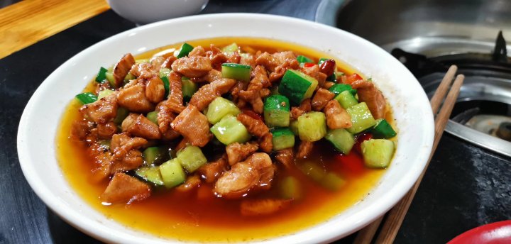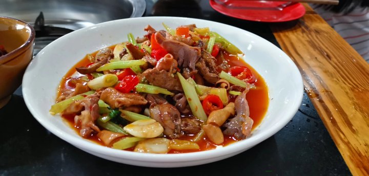 第二天离开酒店后又去了同一家小馆吃了一只鸡(七斤)。店家做的一鸡五吃:凉拌鸡,泡椒鸡杂,宫保鸡丁,芋儿火锅鸡,还有一碗鸡血汤。