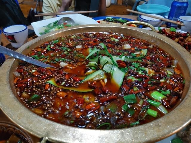 打牙祭的招牌菜,青花椒活鱼。活鱼切片烫入青花椒汤锅里。除了鱼肉很嫩,配菜里的魔芋和黄瓜也非常入味。