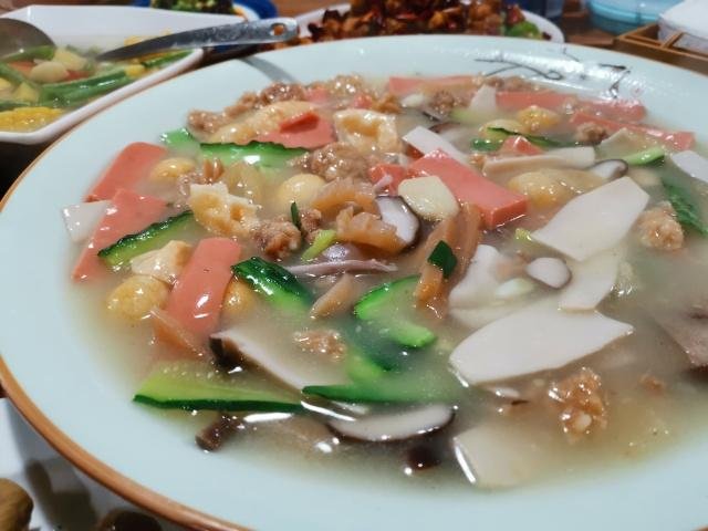 不辣的川菜代表,老师傅烧三鲜。烧三鲜要用水发鱿鱼搭配猪肚,火腿肠,蘑菇,玉兰片(笋片)等鲜味一起烧出来。味道十分鲜美。