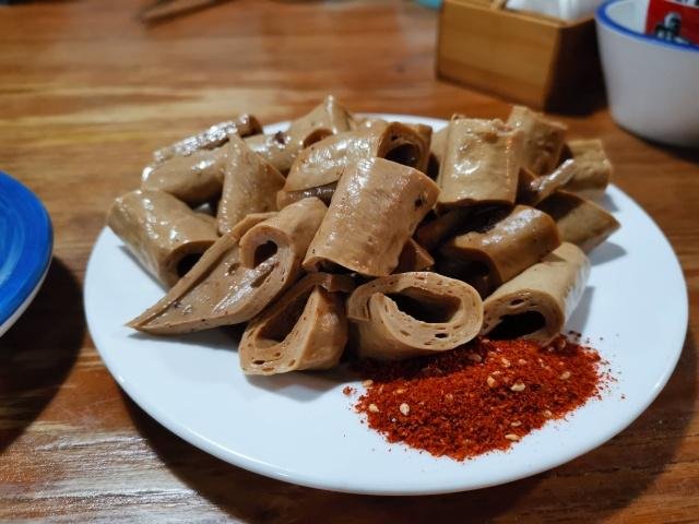 卤味豆筋,豆筋卤过后可以当“素肥肠”吃。记得沾点干辣椒吃才够味。