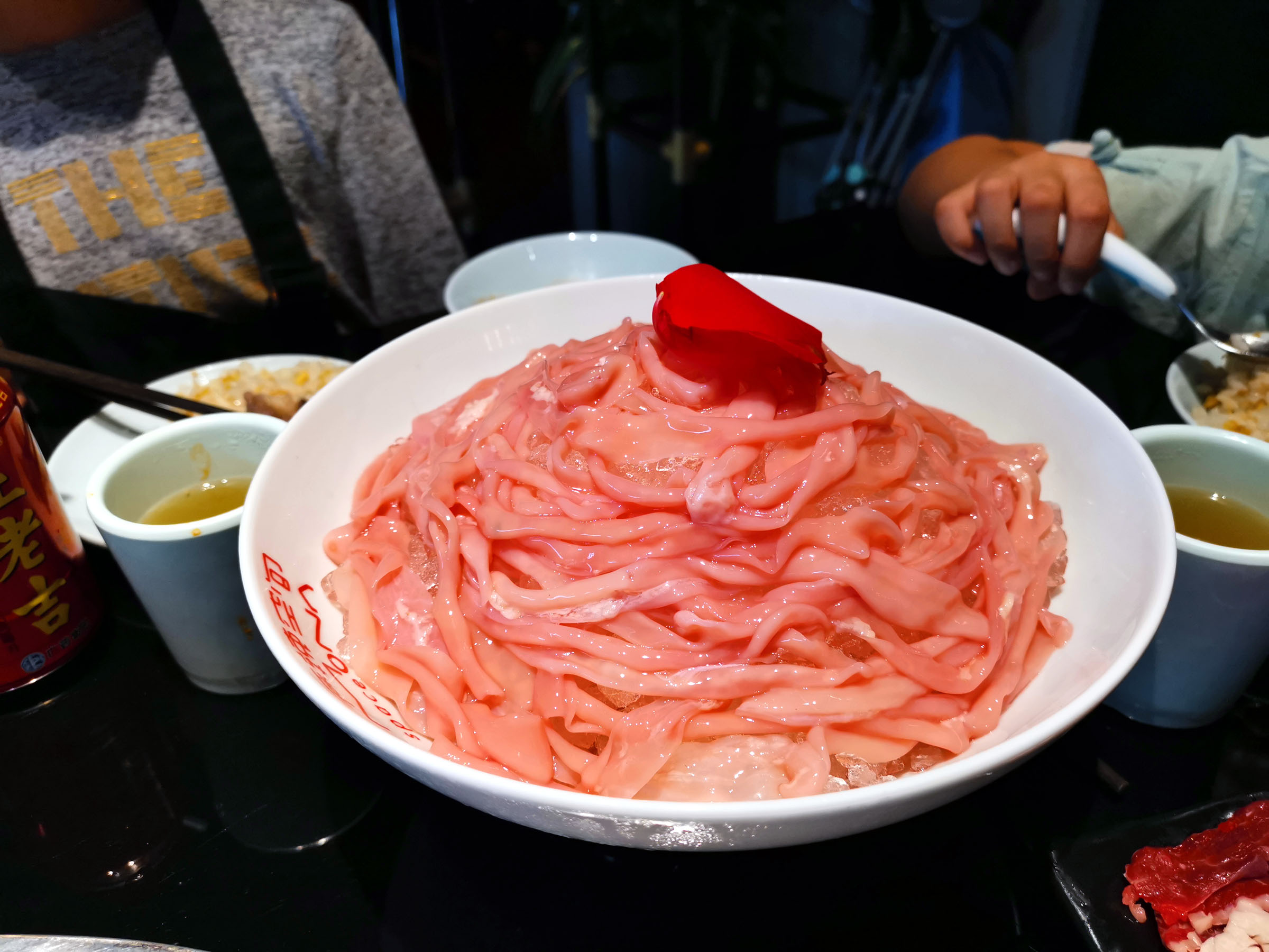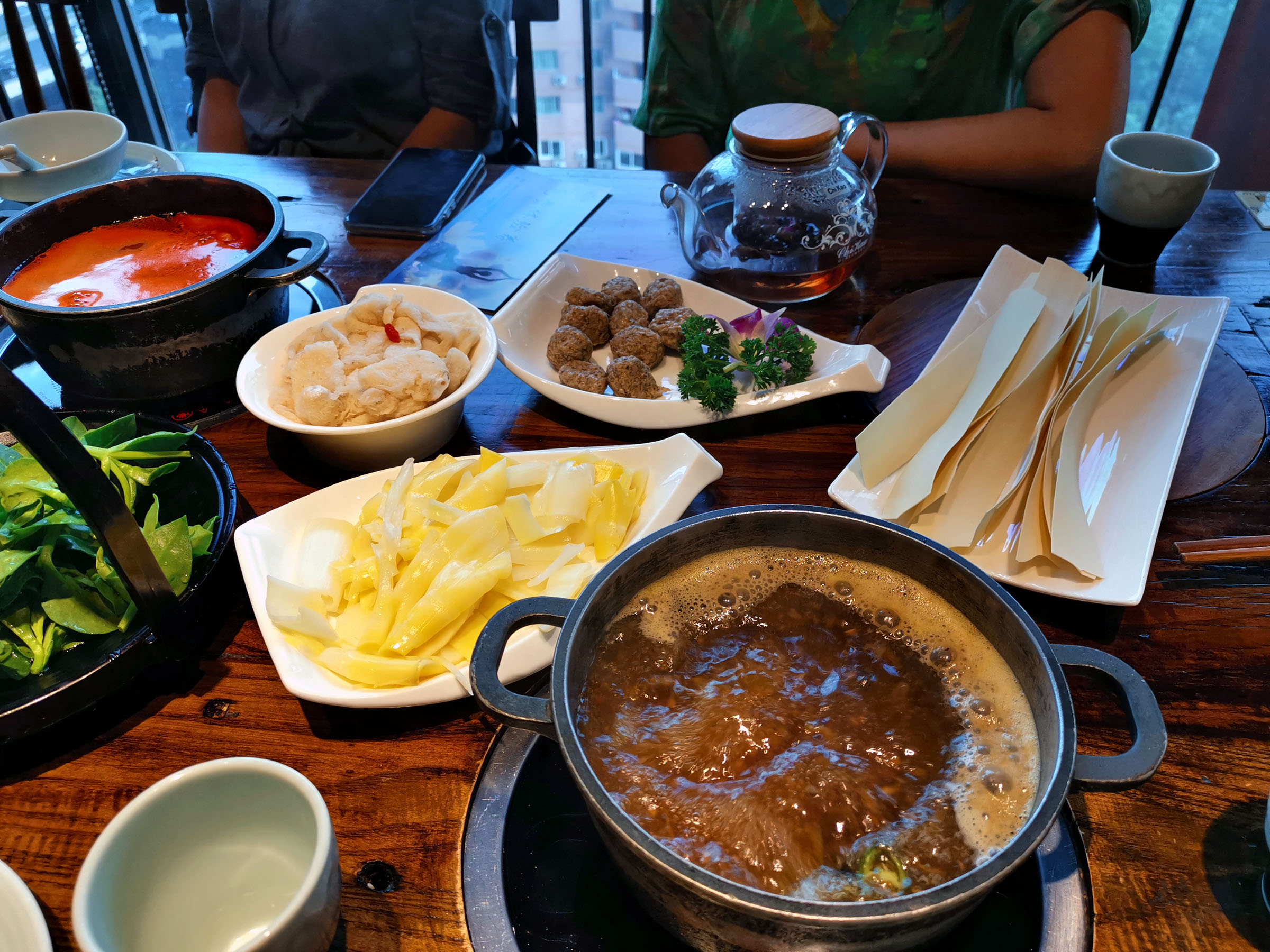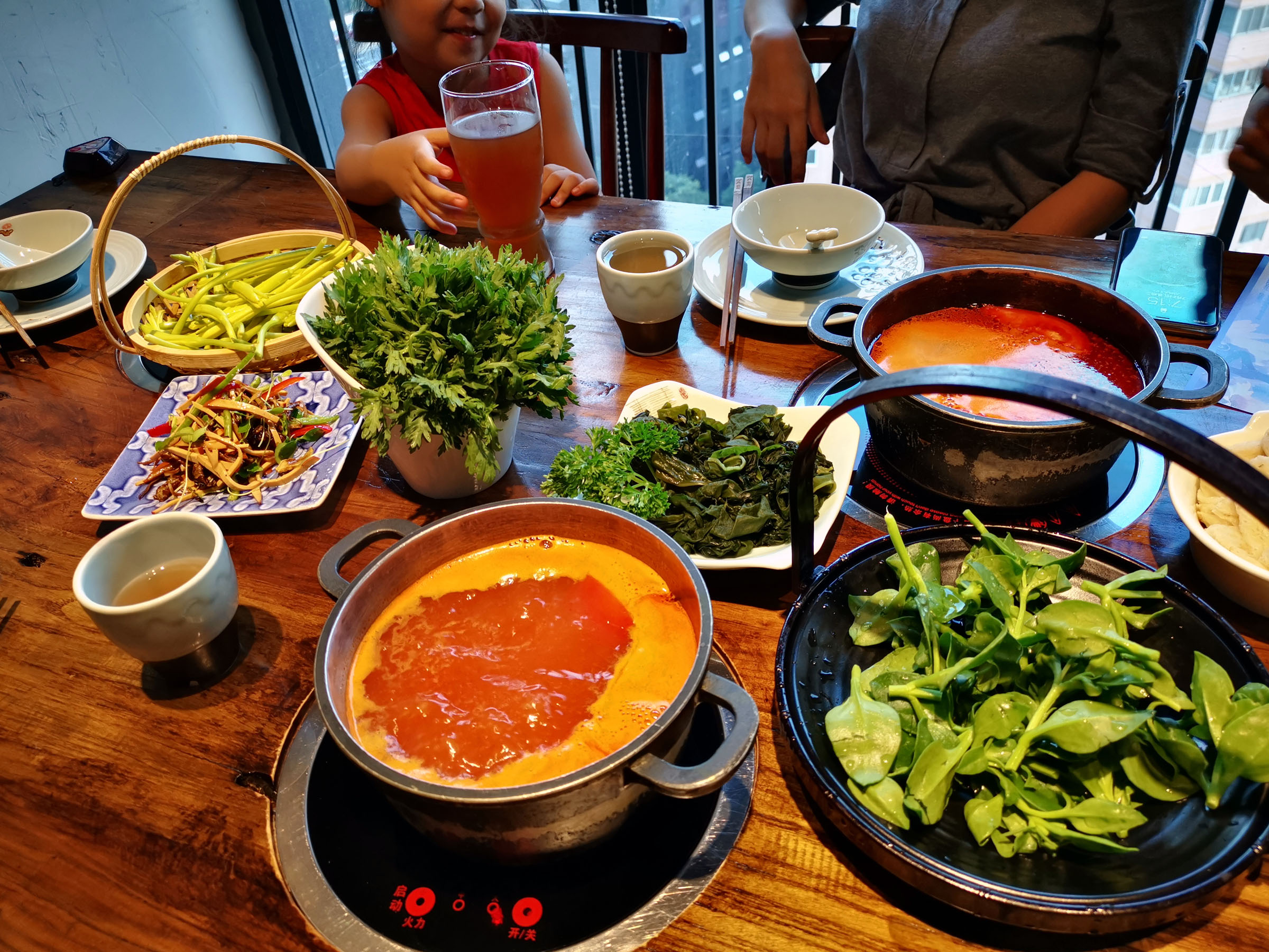 麻辣空间算比较新派的火锅,因为它的菜品不但融合了重庆和成都火锅的食材,还包含了潮汕牛肉火锅的内容。我们同样点了清油锅底,外加一个番茄锅在中间。朋友家的小朋友比我家的大一些,虽然在美国长大缺很敢吃。他们吃了黄喉、鸭肠,觉得脆脆的很好吃,而且他们觉得鸭肠长长的像面条一样。