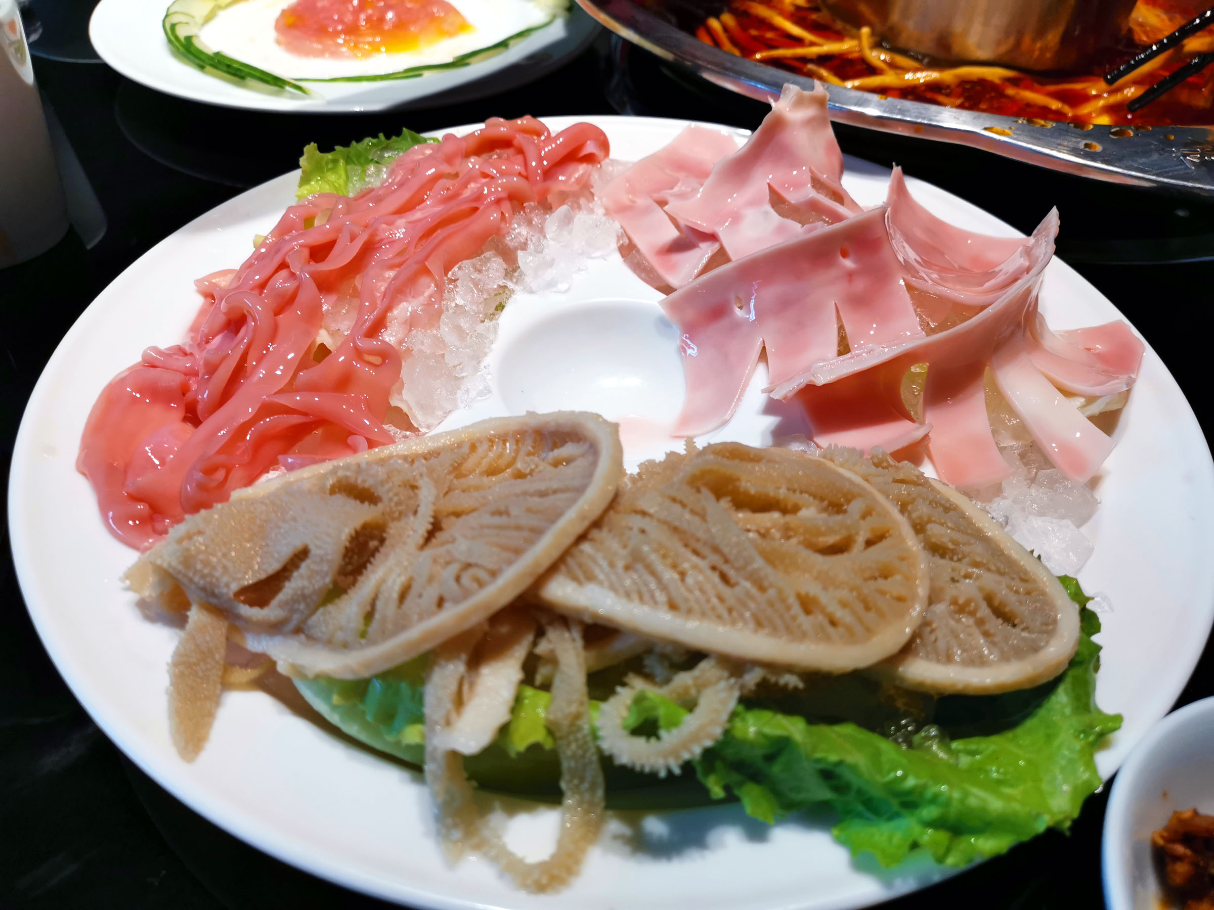 既然吃内脏毛肚、百叶、鸭肠、黄喉等肯定少不了。特别是长长的鸭肠在锅里七上八下的涮一涮,嘎嘣脆。百叶毛肚也是汆烫几秒即可,放入嘴中,一口油香。