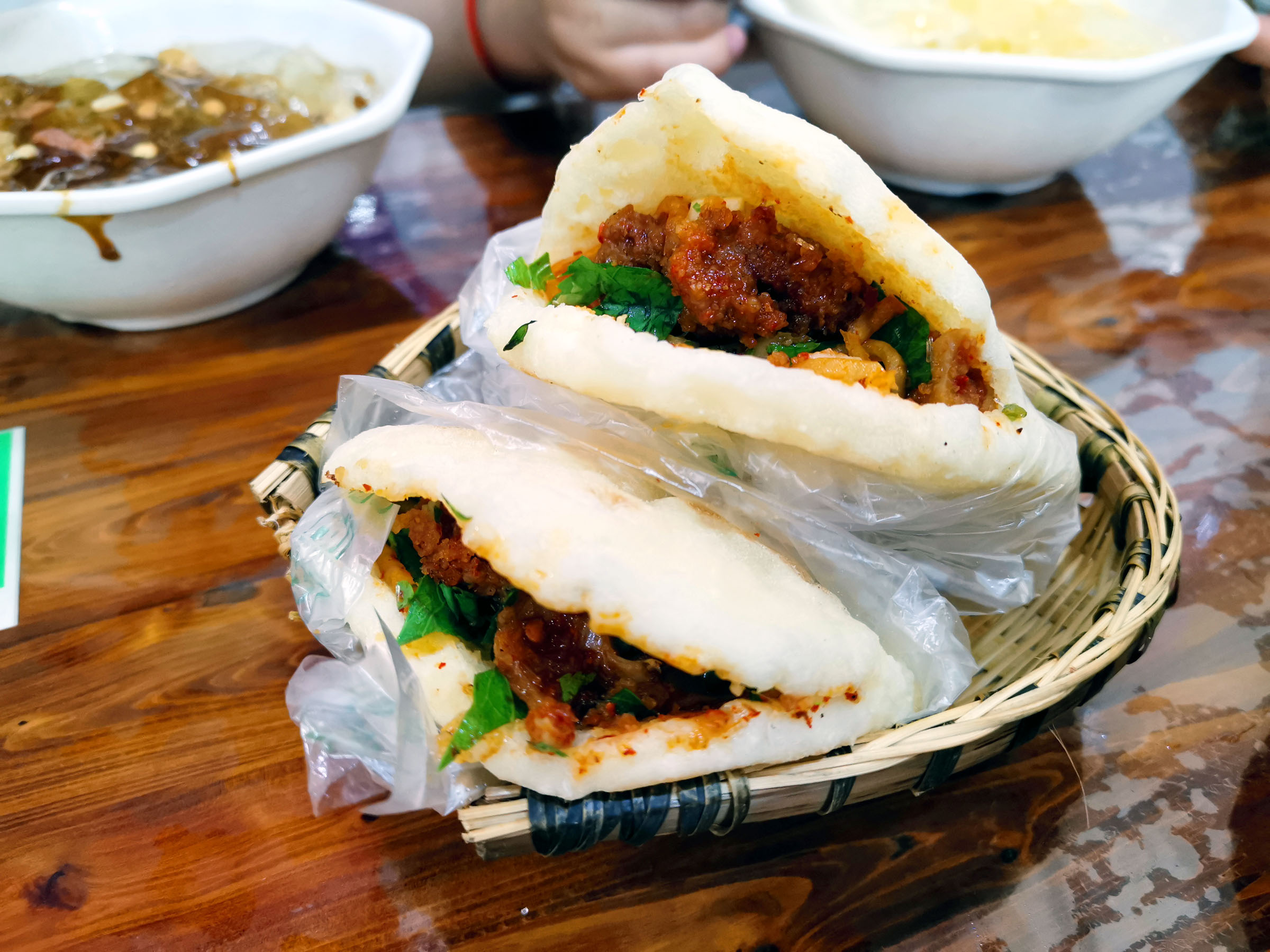 其它的我们还吃了钵钵鸡、炸豆腐果夹的凉拌萝卜丝、麻辣的烤土豆,还有他家第四特色,格格卡饼。我们要的是夹粉蒸肉夹饼,饼是发面饼,夹着香辣味的粉蒸牛肉吃起来很满足。