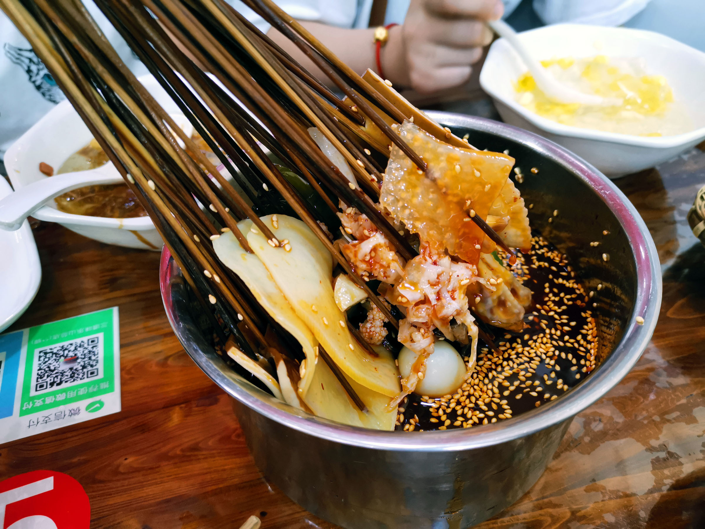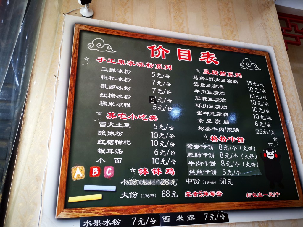 这家店的铺面不算大,我们一行进去都占了一半的位置。他家主要是三种美食:冰粉、豆腐脑(和别处不一样的哦)和钵钵鸡,还有其它各种小吃。