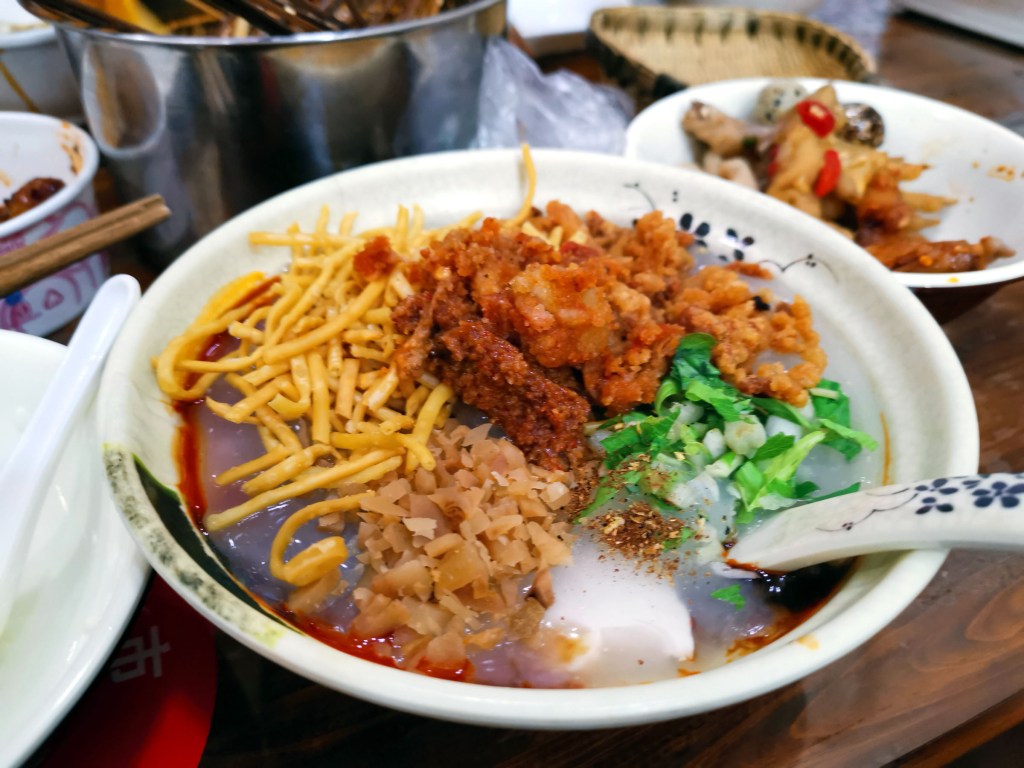 他家的豆腐脑不是北方朋友熟悉的豆腐脑。他家的豆腐脑其实真正的豆腐脑(豆花)只有一锅铲的量,然后上面是想藕粉粘稠状的绿豆粉糊糊,最后在上面加上浇头。浇头可以选粉蒸牛肉、素肉等,搭配碎萝卜干、馓子、葱花配上调味料。吃起来主要是软嫩和酥脆的搭配,被糊糊粘合在一起。有点意思!