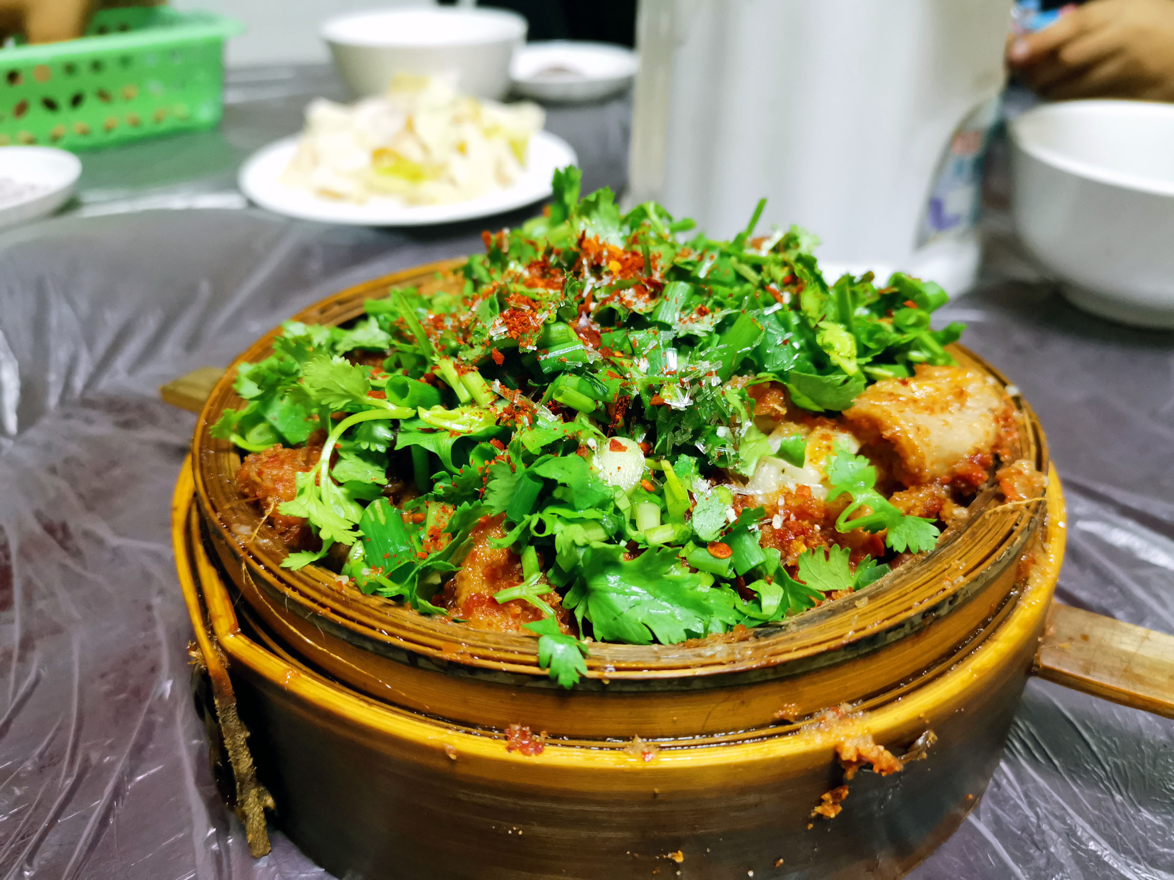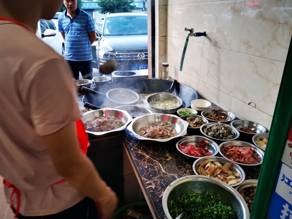 傍晚我们来到苏稽镇吃翘脚牛肉,但是由于当地头一天下暴雨峨眉河水上涨把河边很多店都淹了一晚,所以本打算去的河边店都在停业打扫。后来在离河有点距离的公路边找到一家久芳翘脚牛肉(乐峨路西段411-413号)。