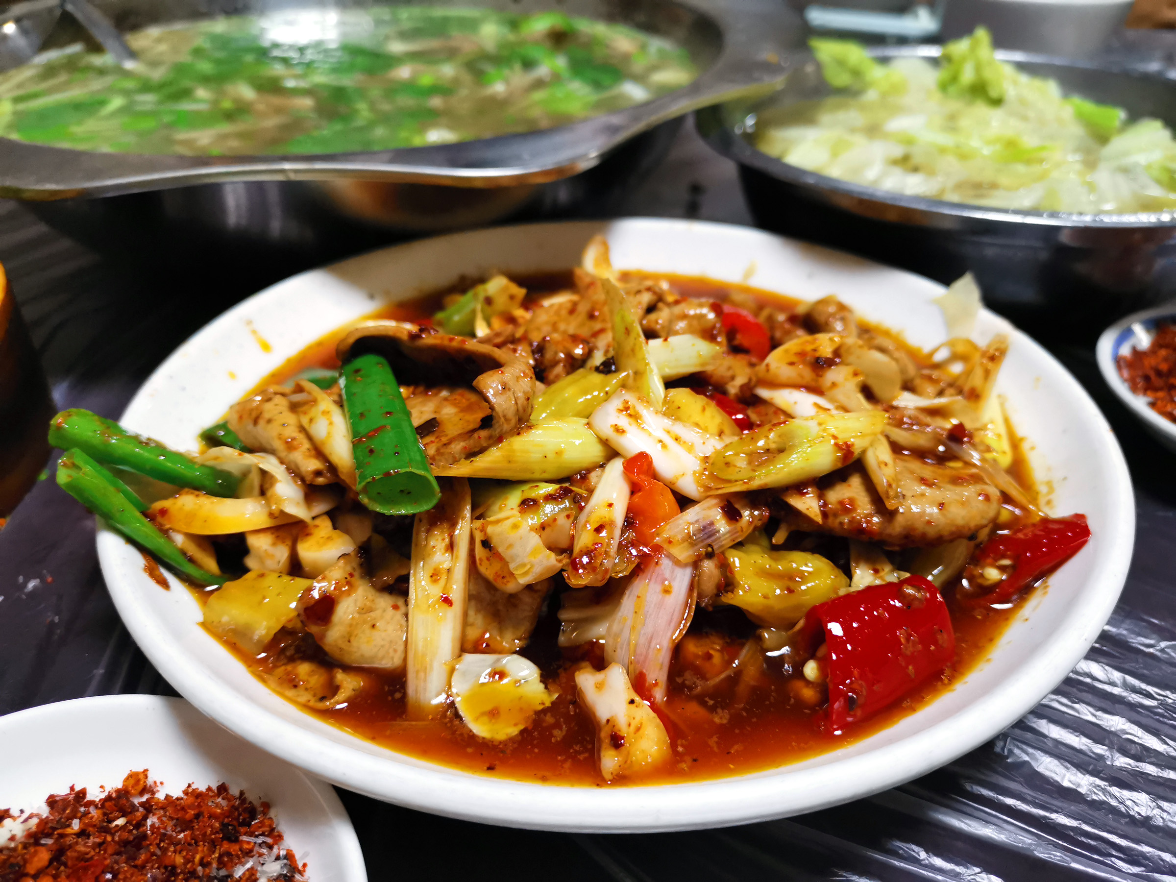 大锅的好吃就是牛肉和各种牛杂都有了,不用纠结点啥,一桌人各取所需。牛肉牛杂直接吃带着一股草药的清香,或者重口味的沾着干辣椒面碟子吃。翘脚牛肉的汤也很好喝,虽然带着一丝草药味,但是非常鲜美。我们有买翘脚牛肉料包带到美国自己煮牛肉吃。