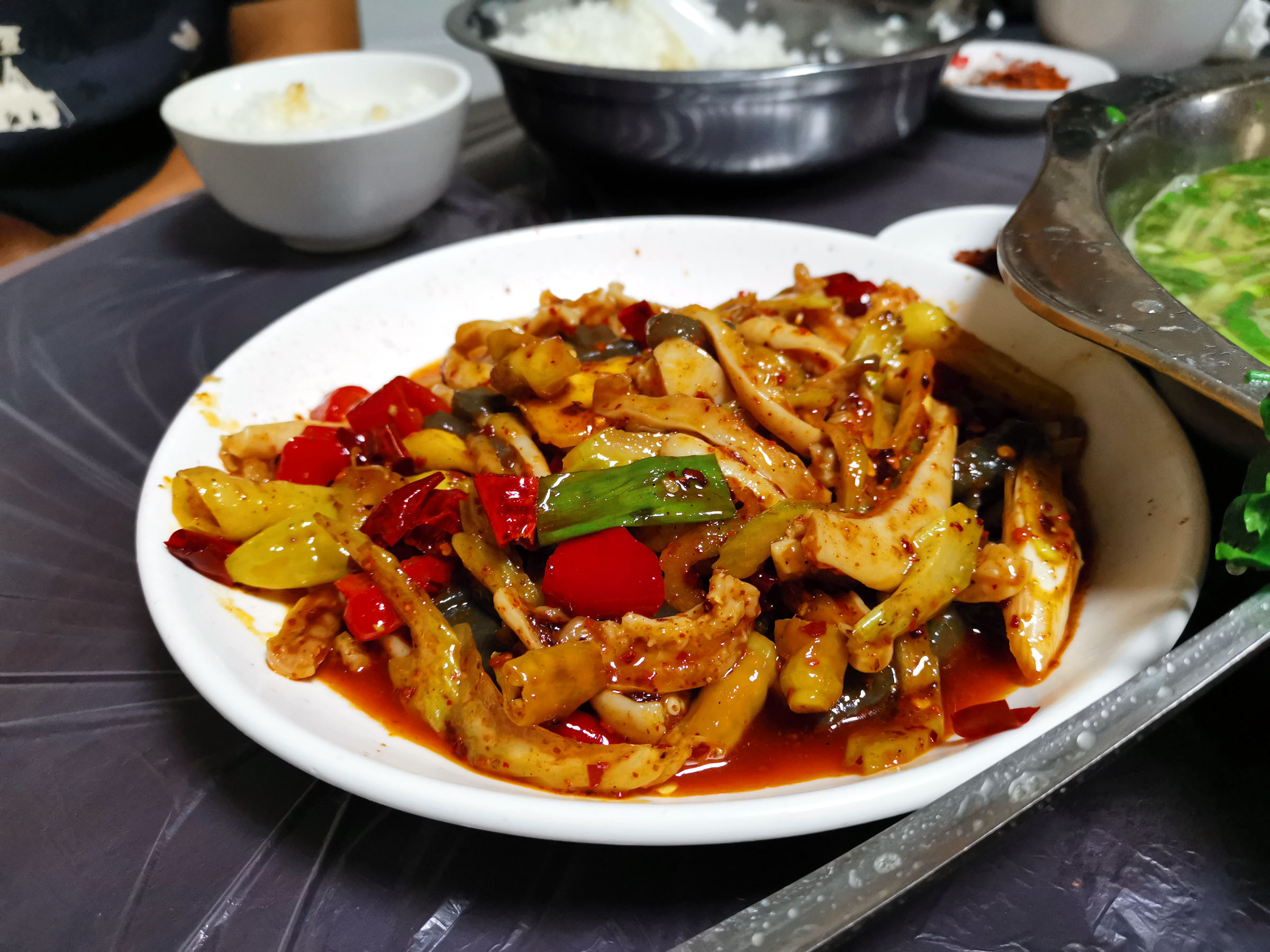 除了重头翘脚牛肉汤,其它还有各种牛肉美食。以下分别是:豆腐烧牛骨髓,烧的是麻婆豆腐的口味;牛版的肝腰合炒;粉蒸牛肉;泡椒牛杂。吃了这些火红的辣菜,赶紧喝一口汤,很是舒坦。