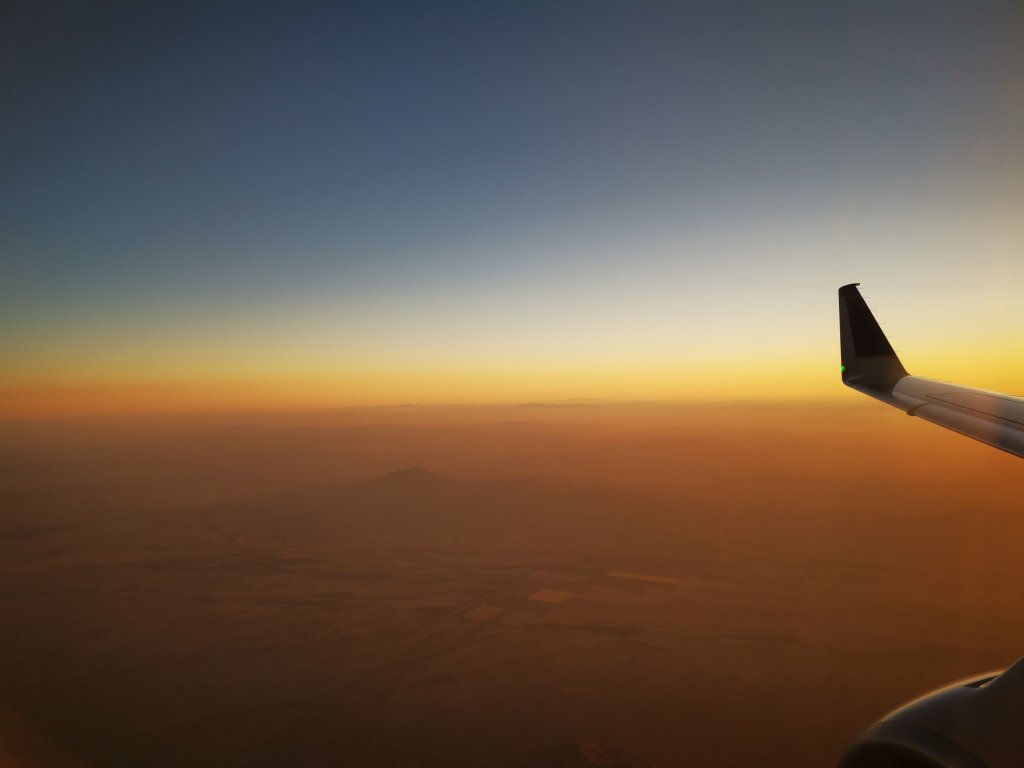 我喜欢坐飞机的一个主要原因是我喜欢在天上看大自然的美景。所以傍晚从旧金山向南飞亚利桑那的航班我选择的靠右侧(西面)的座位。这样可以看到美丽的太平洋海岸线和夕阳的余辉。