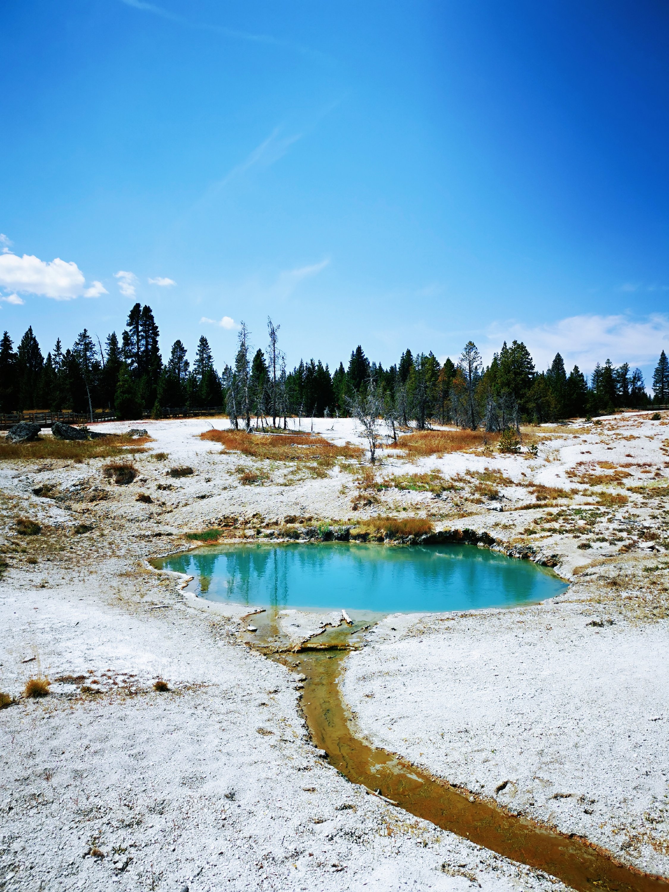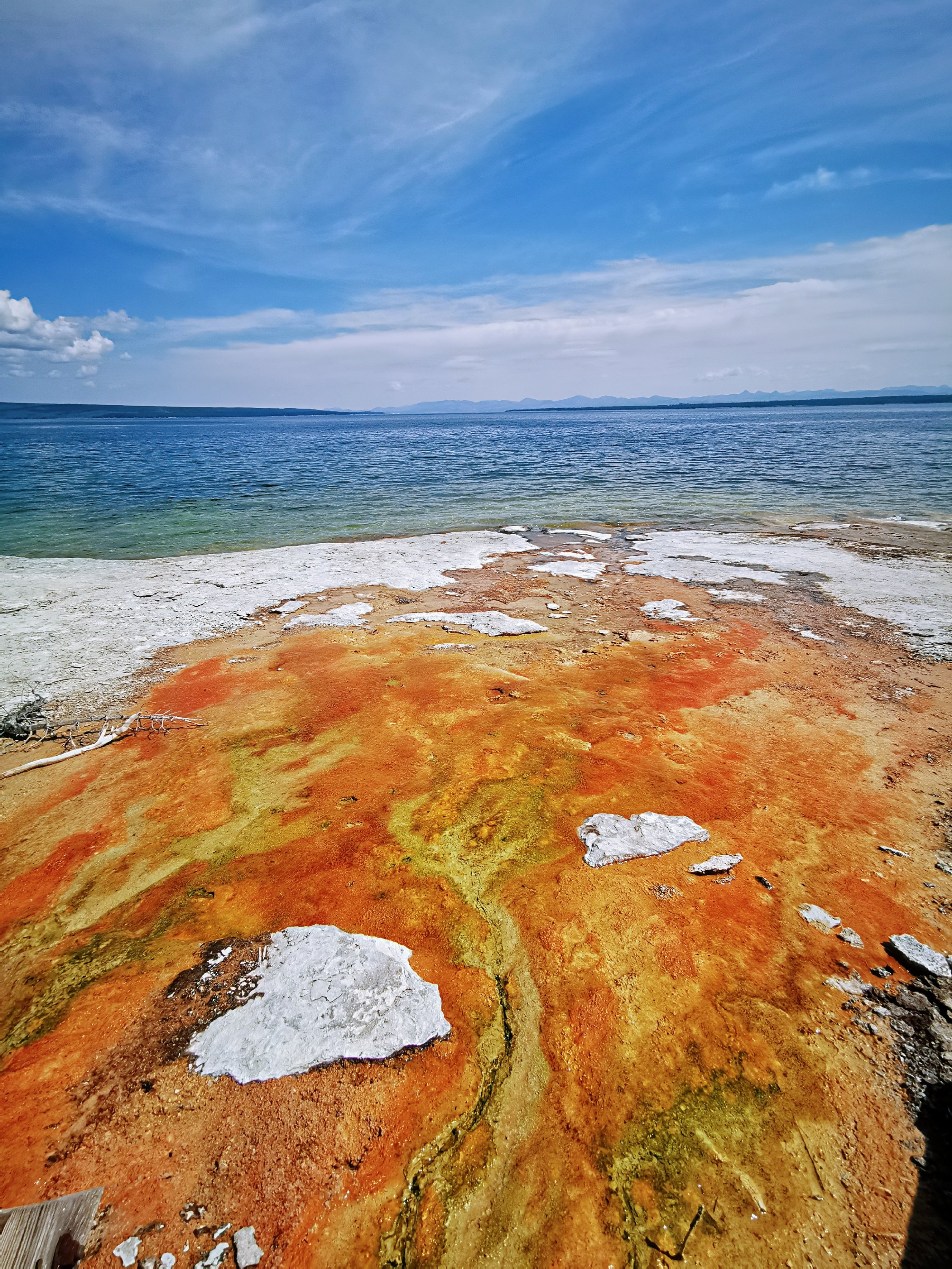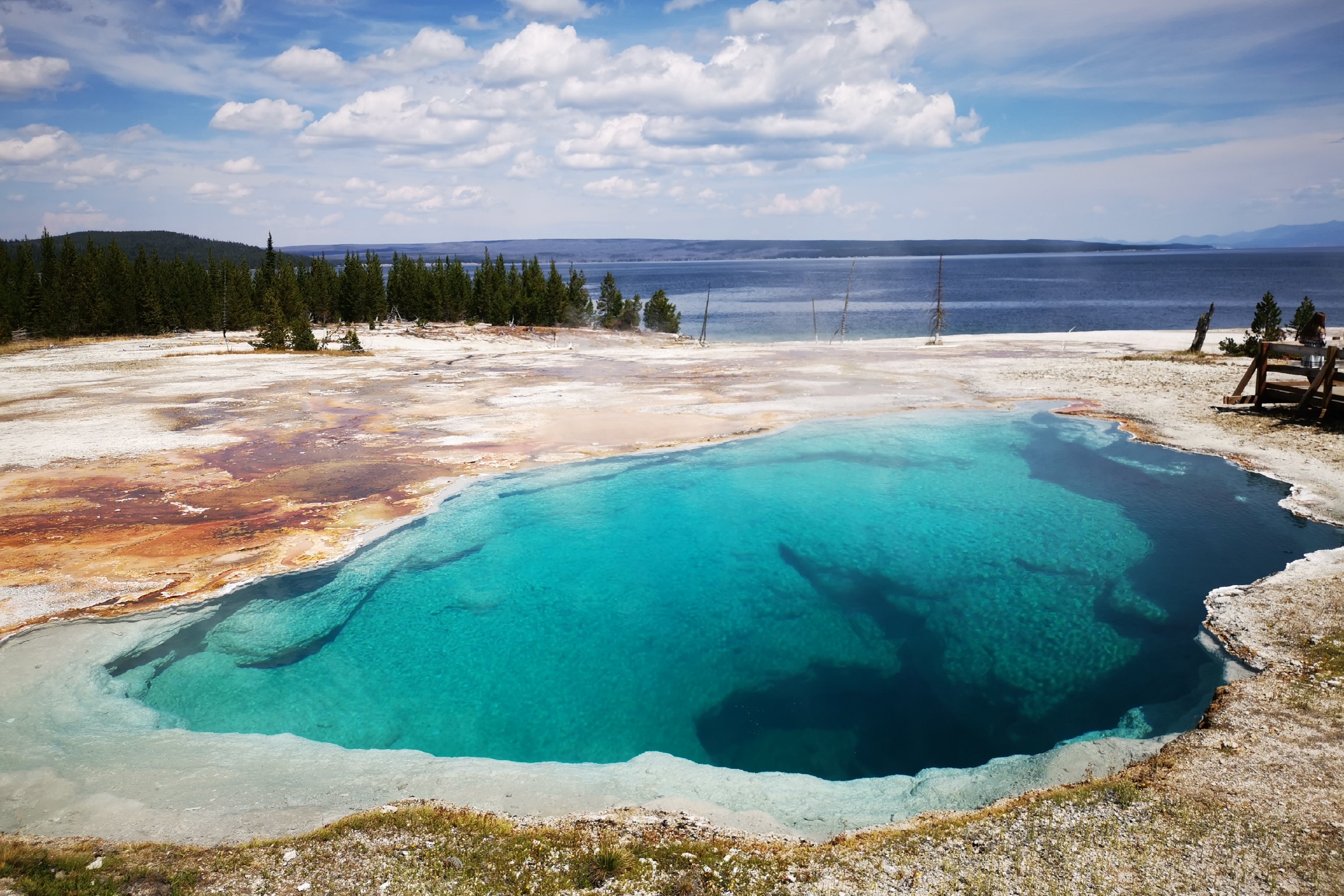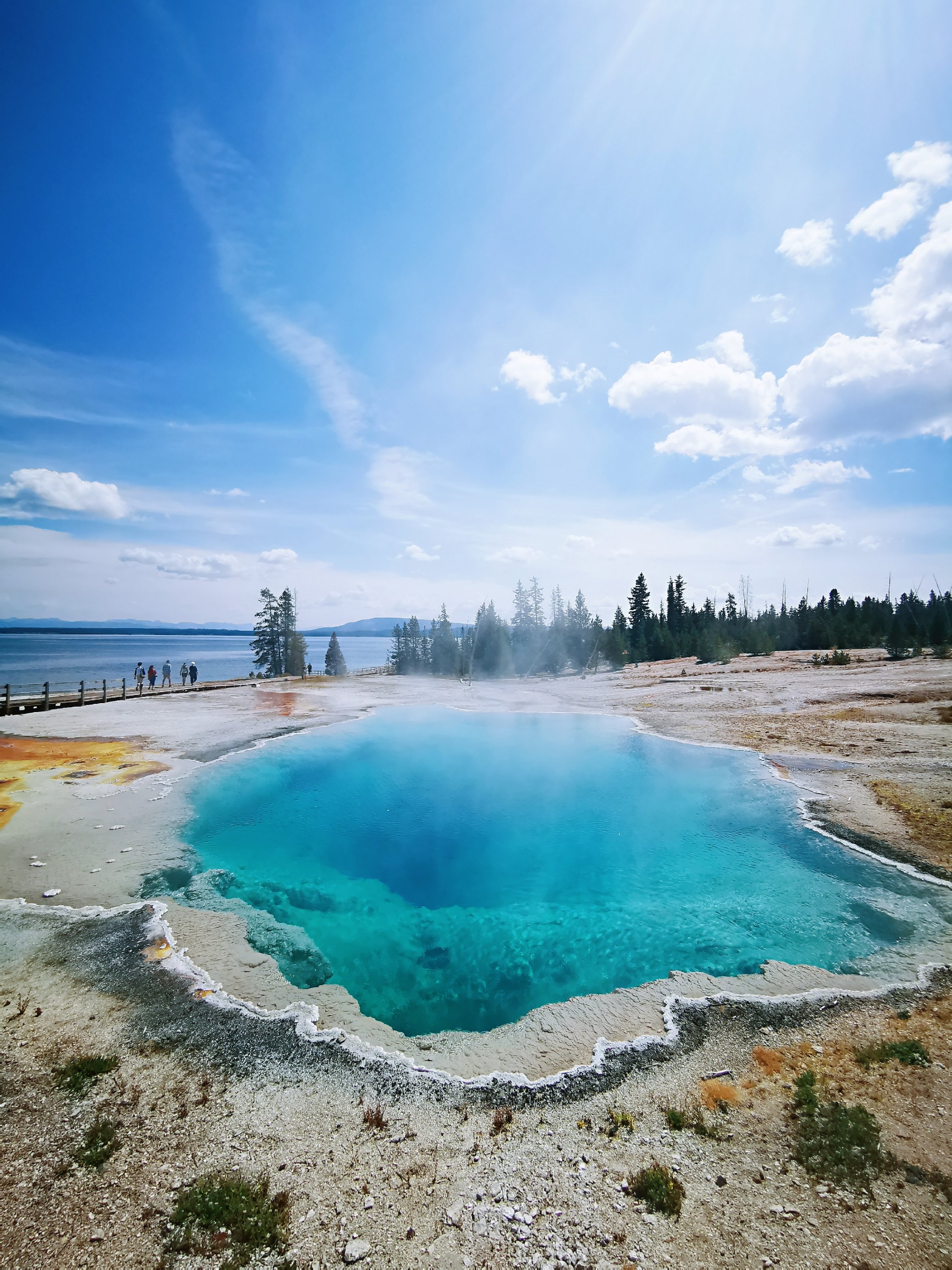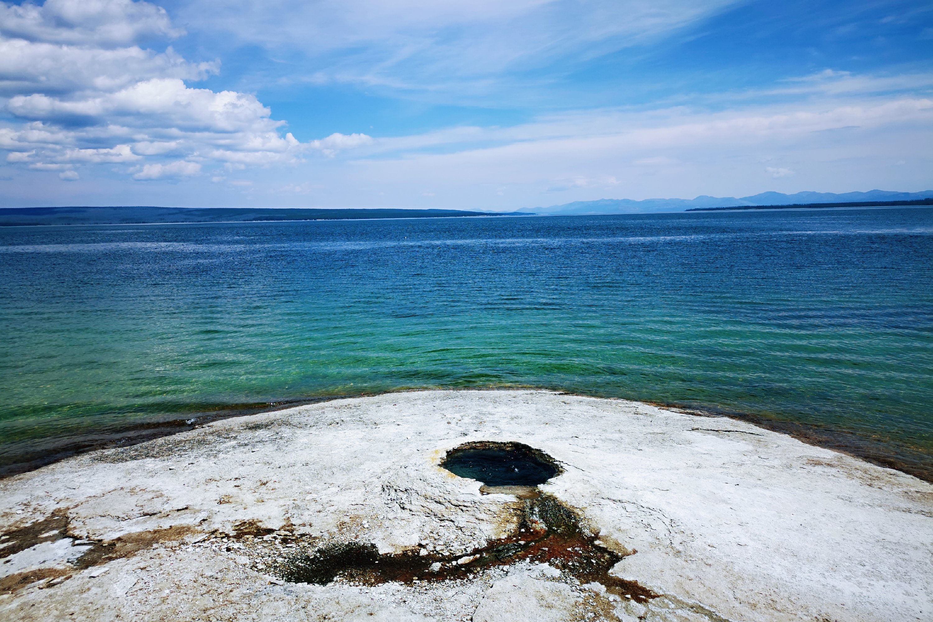 西指间歇泉盆地 West Thumb Geyser Basin,位于黄石8字形路线的最南端,也处于黄石湖的西端。在一块两个足球场大小的区域内有十几处间歇泉和温泉。