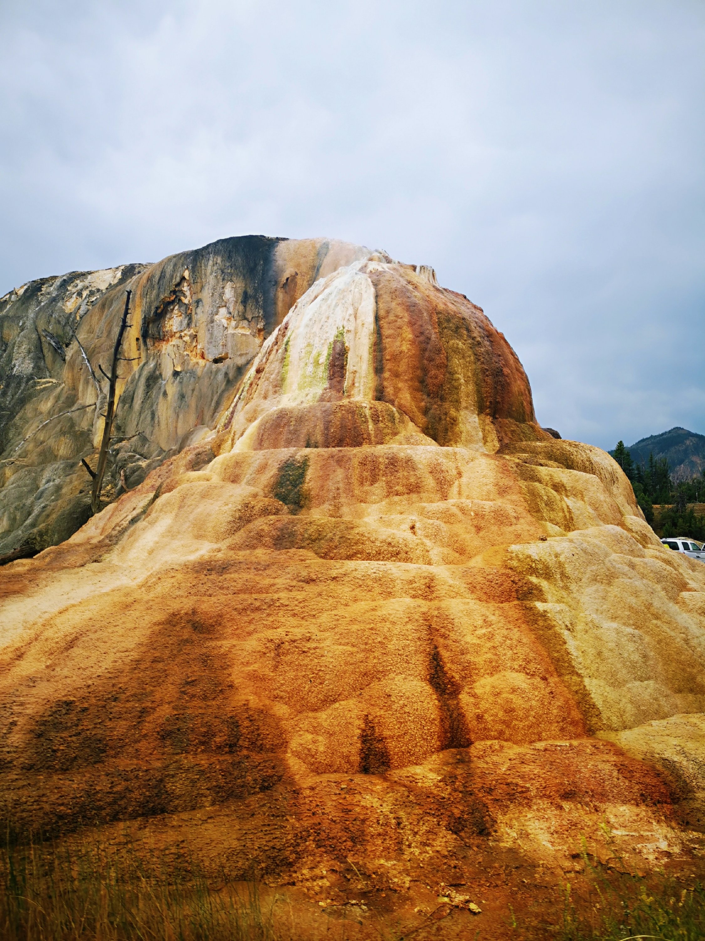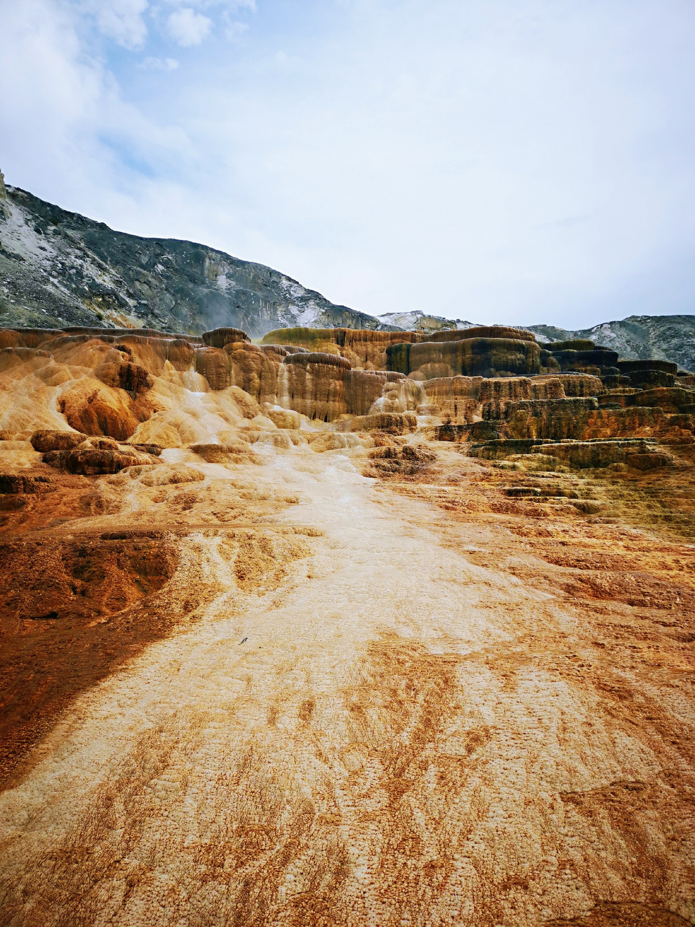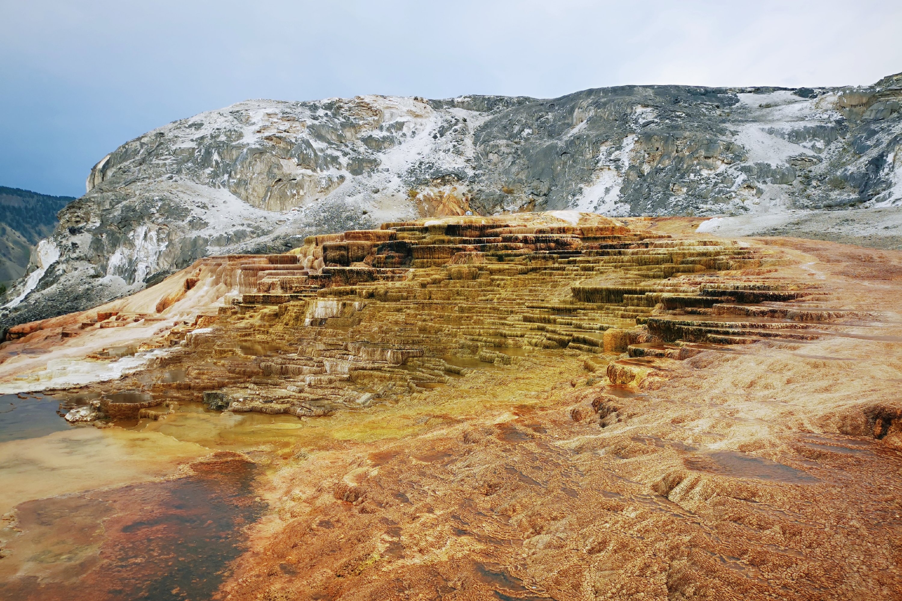 猛犸温泉景区坐落在黄石公园的西北角,8字路线的左上角。这里因为富含矿物质的温泉顺着山坡慢慢地流淌而形成了不同色彩和形状的梯田和水池。