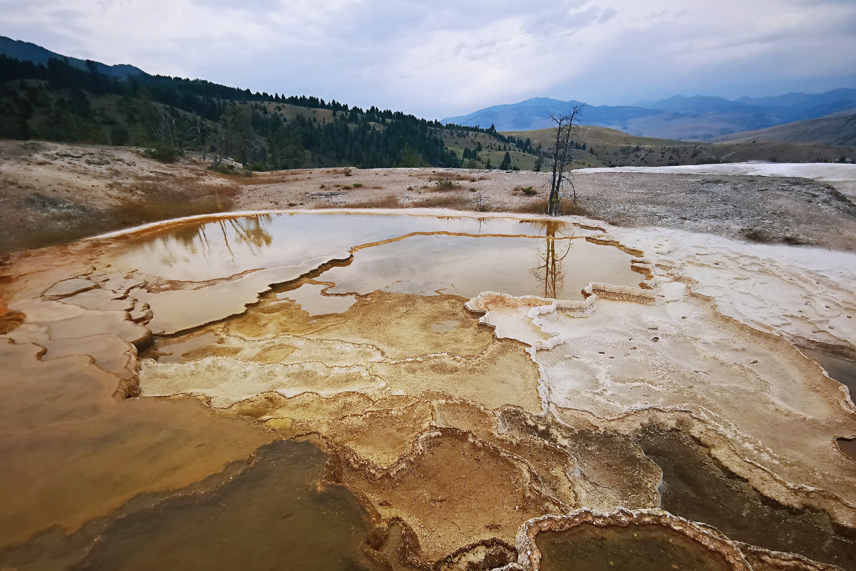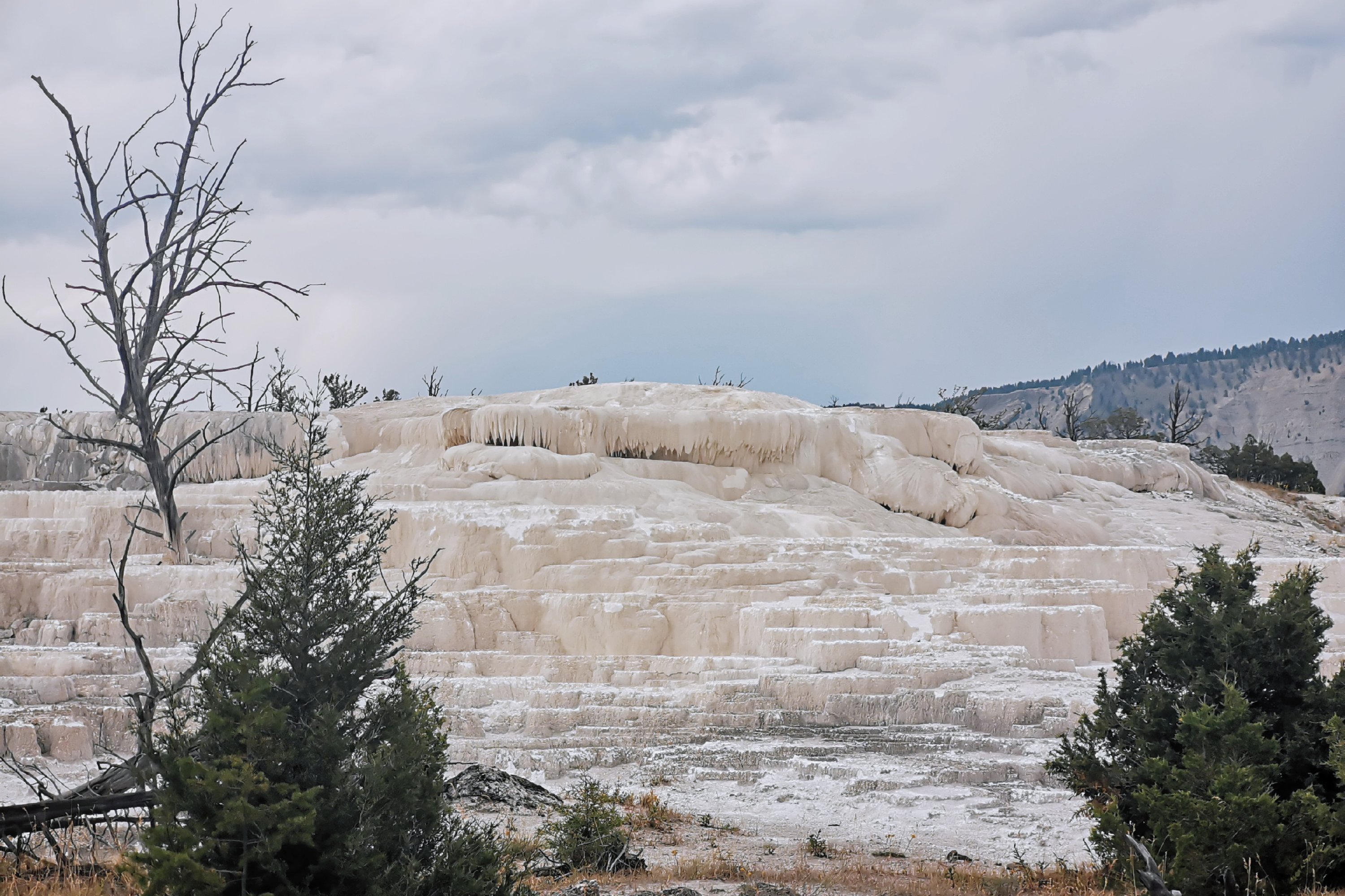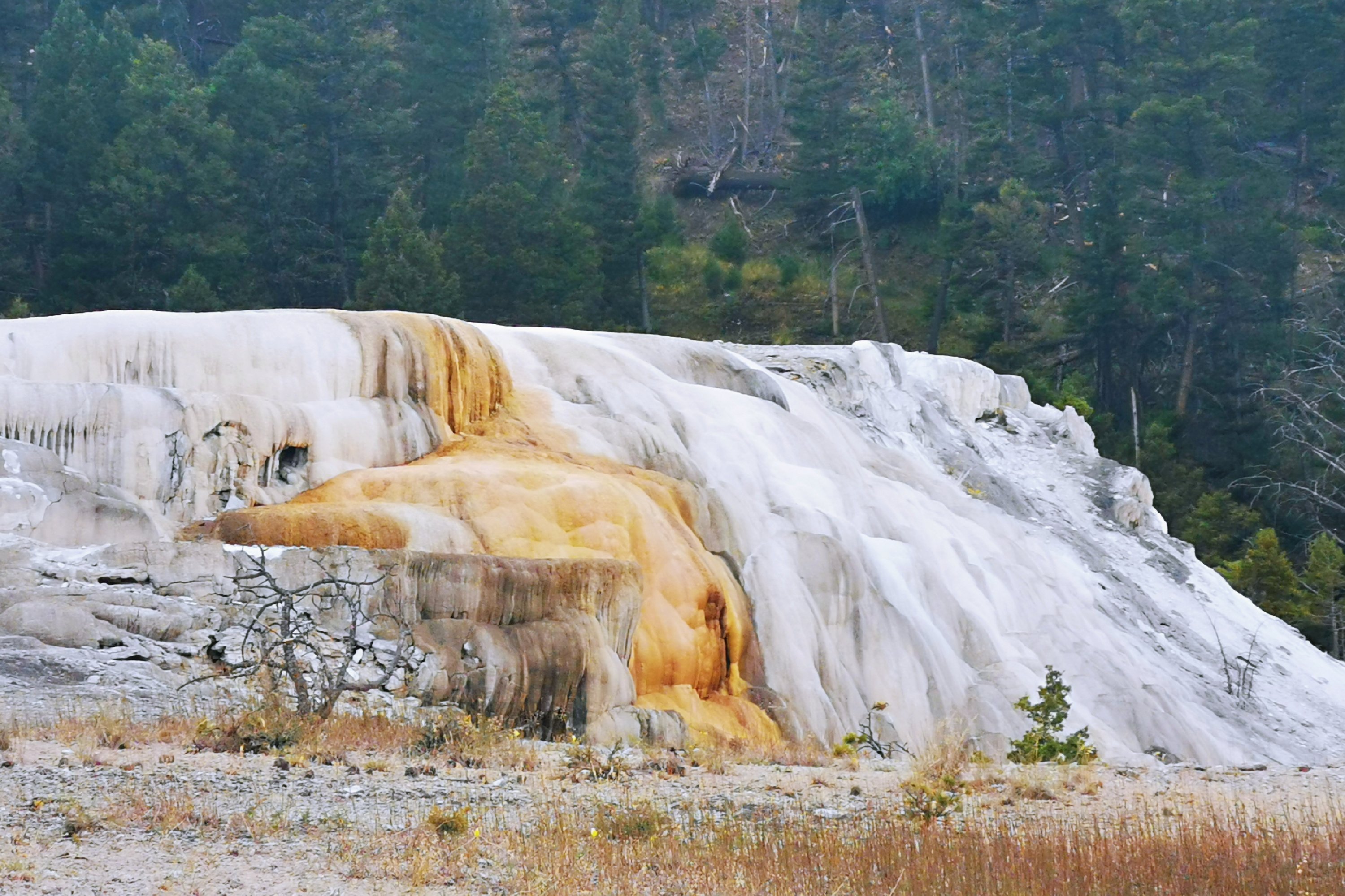 猛犸的大部分热泉都不再流,死掉的细菌变成灰白色的粉末,使猛犸象热泉失去了颜色,但也造就了奇特的地貌。
