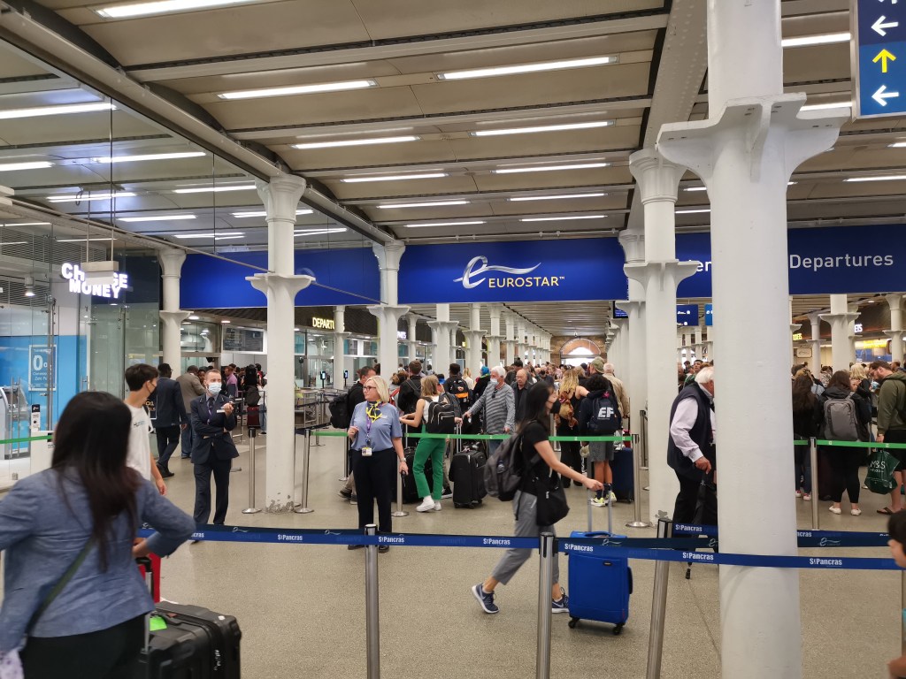 进站时,先扫描车票通过电子门,然后过法国的边检(border control)。因为英国不属于申根国,所以往返都需要过边检,且都是在上车那一边。这样下车就可以拎着箱子出站了。边检后到候车厅等候。伦敦这边的候车厅在一楼,列车停在二楼。