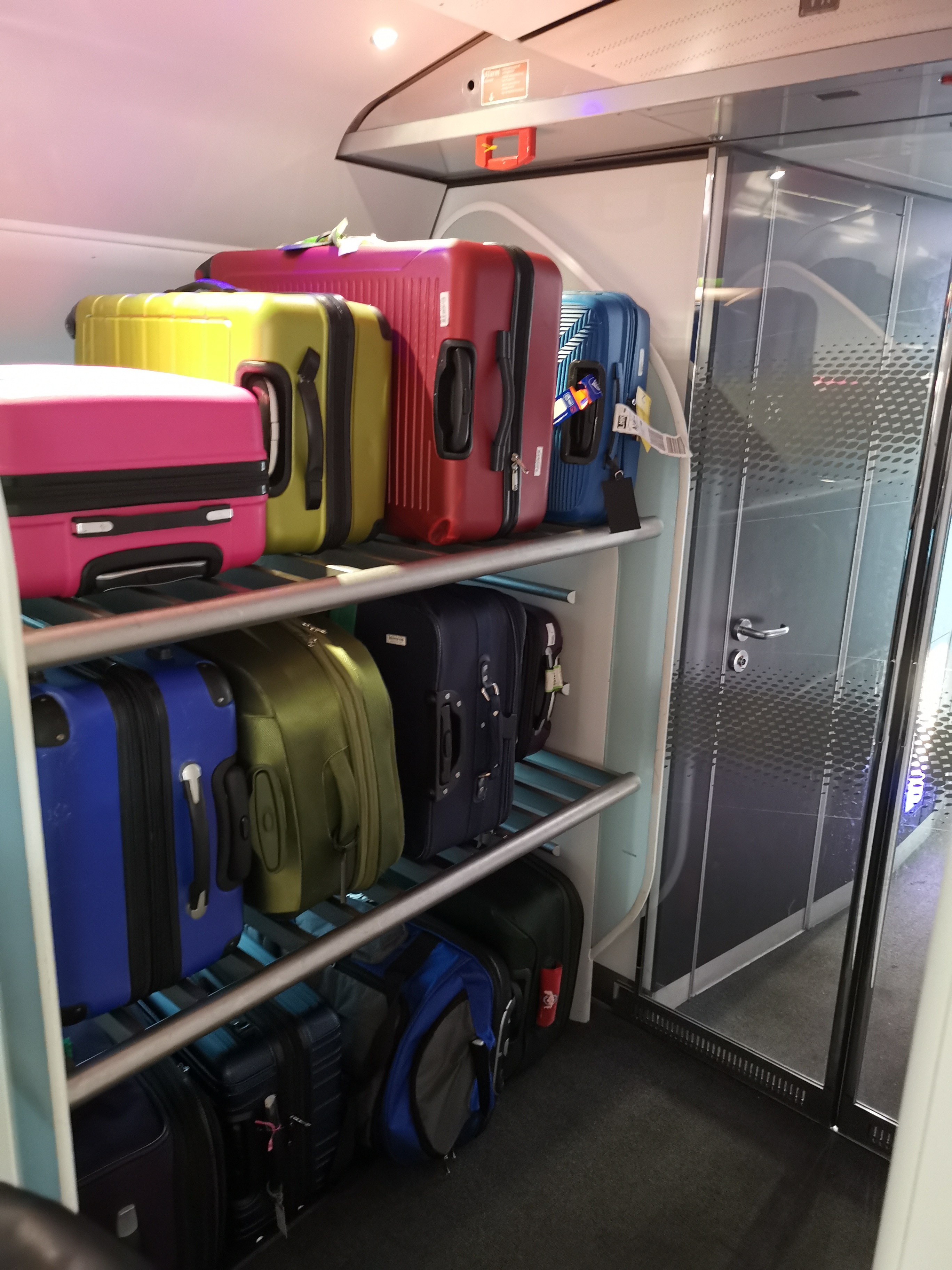 车厢两头有放置大号行李箱的行李架,座位上方有放手提行李的行李架。车厢两头还有垃圾桶和厕所。厕所空间倒是很宽敞,但是马桶经常是堵塞状态。