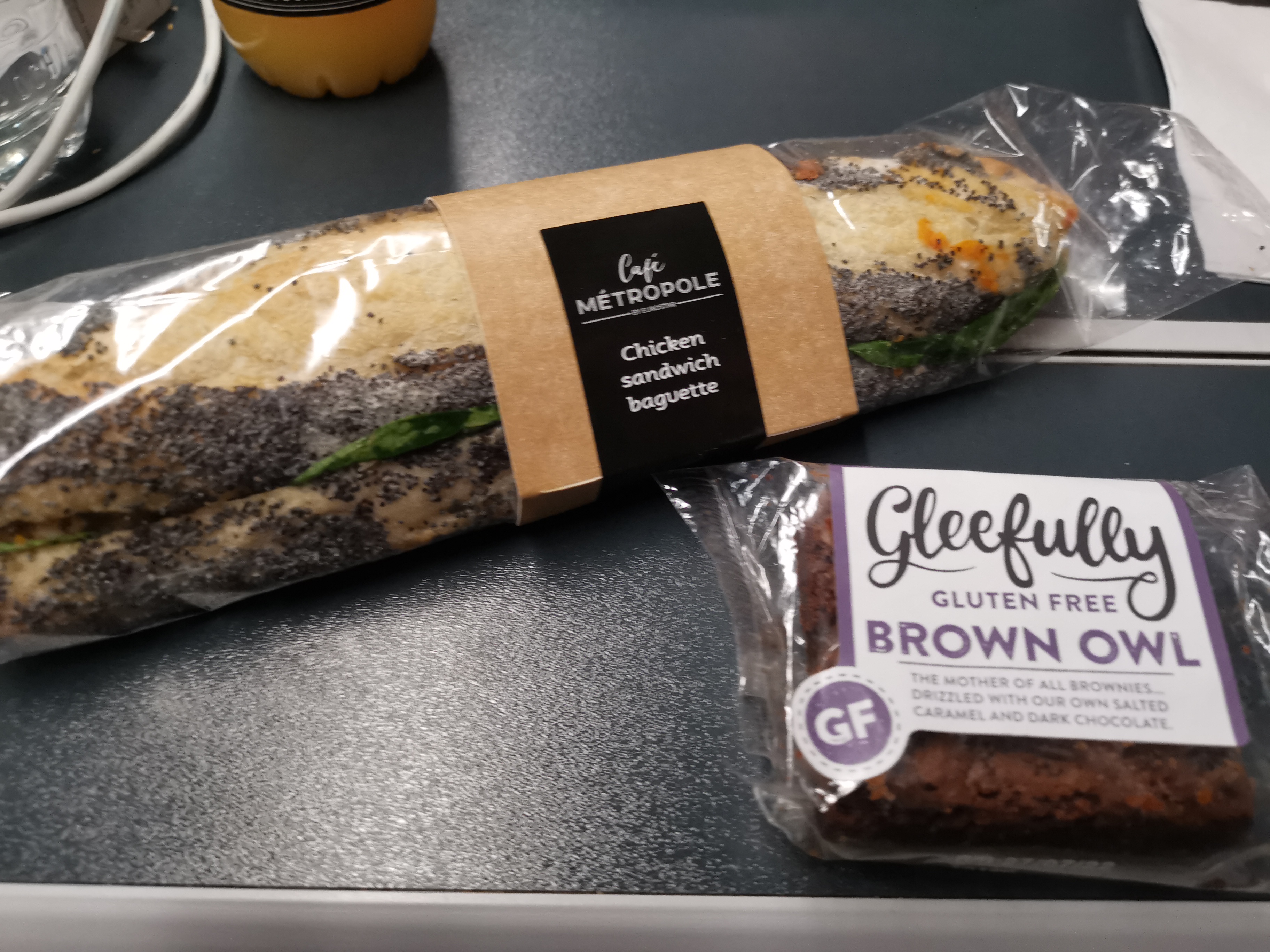 候车厅里有餐厅,看时间可以在这里吃东西或者购买食物带上车吃。由于疫情,现在列车上没有热额食物,而且选择很少。下图是列车上的食物,冷冷的三明治和巧克力布朗尼。好怀念国内火车上的盒饭啊,呵呵呵。